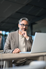 Smiling busy mid aged mature professional business man entrepreneur wearing suit and eyeglasses sitting at table outdoors working online using laptop computer hybrid working outside office. Vertical