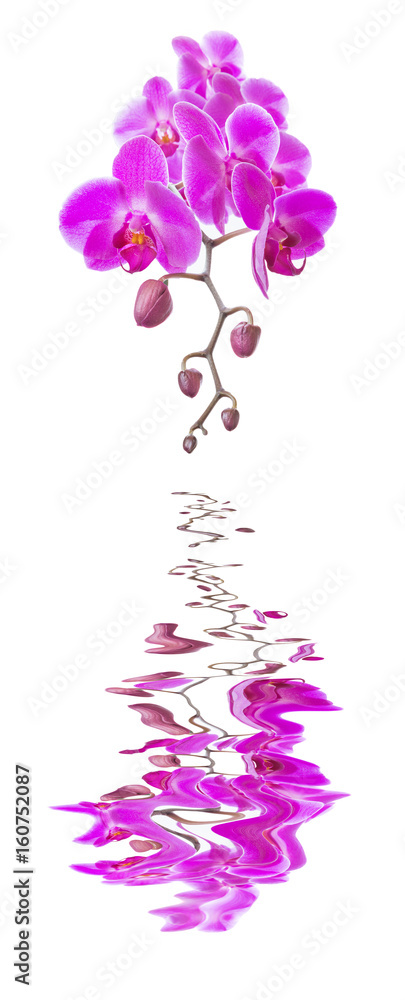 Pink orchid on a white background reflected in a water