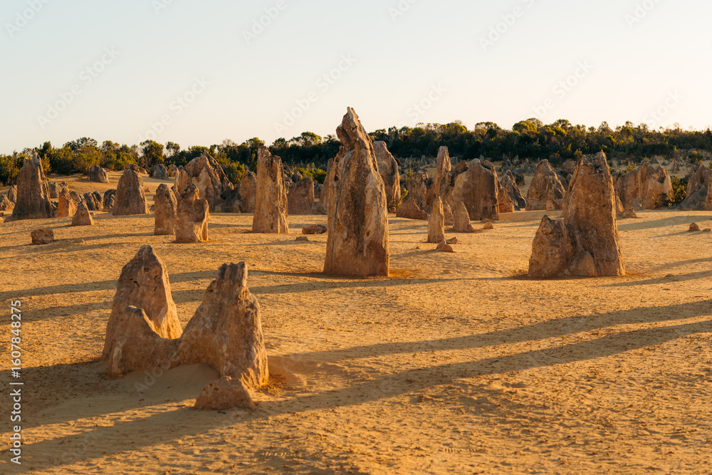 Golden light illuminates the Pinnacles, ancient rock formations in Western Australia