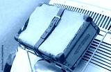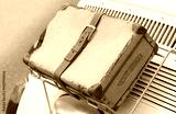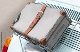 An old used suitcase is attached to the outside of a car with a leather strap and photographed from the side.