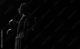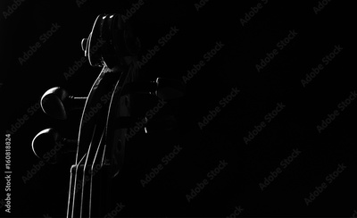 Close-up details of Violin head isolated on black background with copy space. Cello scroll on headstock and tuning pegs.