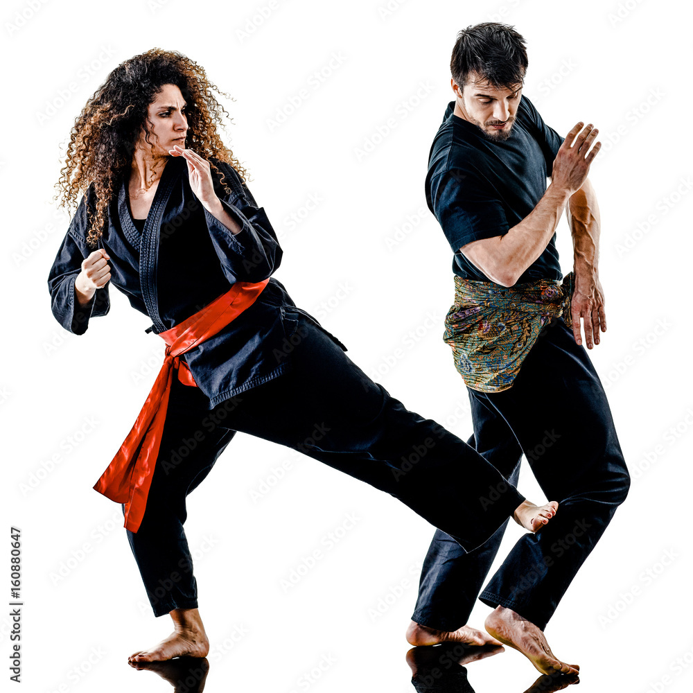 one caucasian woman practicing martial arts Kung Fu Pencak Silat in studio isolated on white background