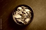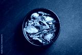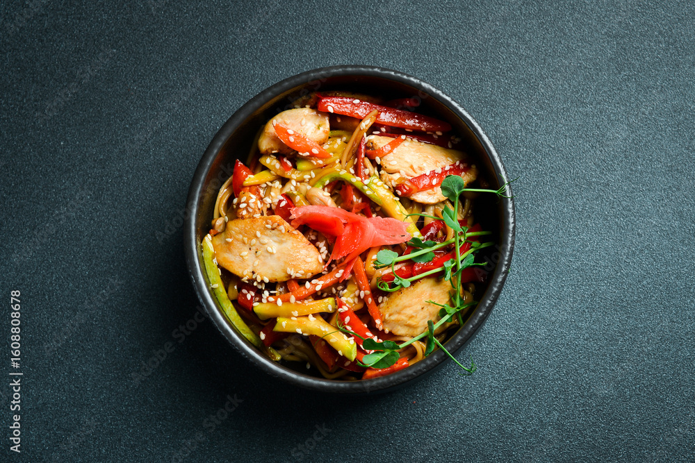 Udon pasta with chicken and ginger. In a black plate. Japanese cuisine. On a dark background, close-up.