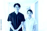 スクラブ姿の医療従事者,医療スタッフ,医師の男性と白衣姿の看護師の女性