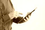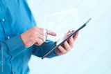 Professional using a tablet to interact with a virtual credit card interface, symbolizing secure online transactions, cutting-edge technology, and digital banking innovation
