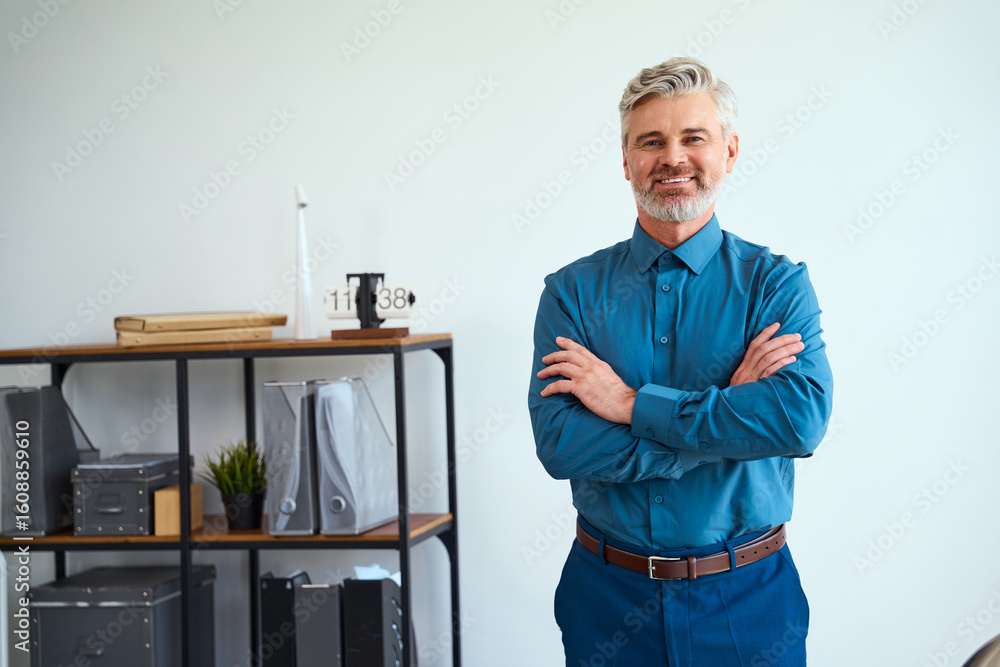 Confident Mature Professional Man Smiling in Office Environment with Modern Minimalist Decor and Shelves, Wearing Smart Attire, Portraying Success, Leadership, Business Concepts