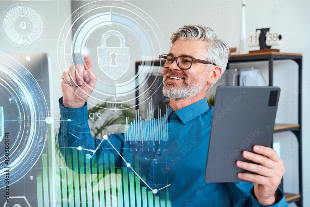 Confident Mature Professional Using Virtual Interface for Cybersecurity and Data Analytics in a Modern Office. Emphasizing Innovation, Technology, Digital Security, and Advanced Analytics.