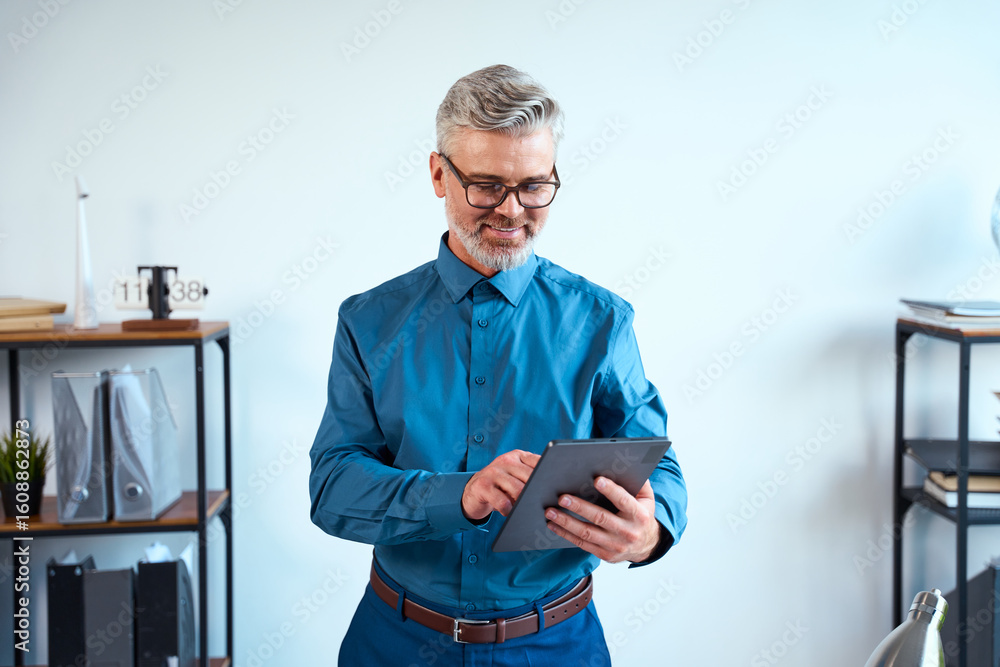 Professional senior man using a digital tablet in a modern office setting. Conceptual themes include technology, business, and professional lifestyle