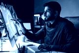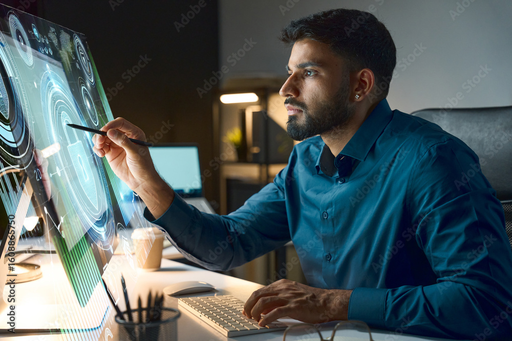 Professional working on a futuristic digital interface in a modern, dimly-lit office, focused on interactive visual data and technology advancement. Concept of innovation, digital transformation