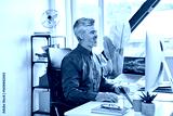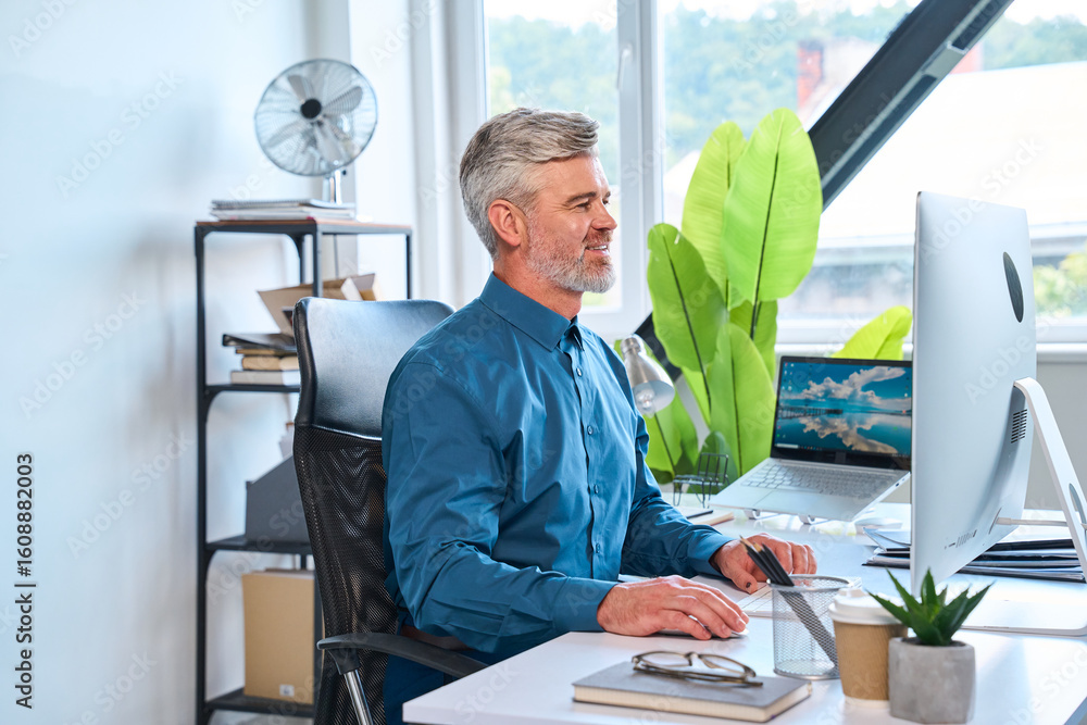 Professional Mature Man Working On Computer In Modern Office. Technology, Productivity, And Work Concepts. Stylish Workspace With Green Plant Decor Inspiring Creativity And Leadership.
