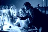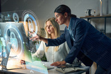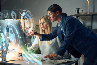 Two Professionals Engaging With Advanced Virtual Interface Displaying Cybersecurity Concepts, Symbolizing Technology Innovation, Data Protection, And Collaboration In A Professional Environment