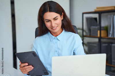 Professional Woman Engaged In Digital Work Using A Tablet And Laptop Within A Modern Office Setting, Representing Productivity, Technology Integration, And Contemporary Workspace Design