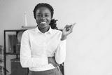 Professional Woman Smiling Confidently While Gesturing in Modern Office Environment. Business, Empowerment, Leadership Concepts Showcased Through Positive Attitude and Friendly Expression.