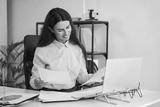 Professional Woman Reviewing Documents At Her Desk, Smiling While Working On A Laptop In A Modern Office, Concept Of Career Dedication, Business Success, And Productive Office Environment