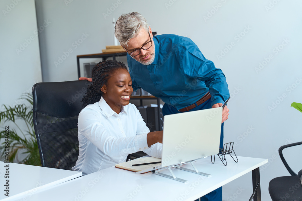 Collaborative office interaction between a senior male mentor and a young female professional, brainstorming together using a computer..