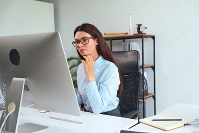 Focused Office Worker Sitting At Desk And Using Desktop Computer, Analyzing Information And Strategizing. Professional Working Environment With Modern Design And Organized Workspace.
