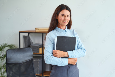 Professional Woman Standing Confidently In Office Holding Folder, Smiling And Exuding Leadership. Modern Workspace With Stylish Shelves And Seating, Representing Business, Career, Success,
