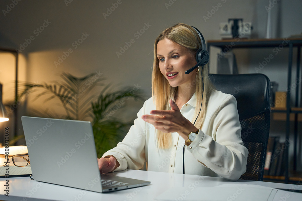Professional Woman Wearing Headset Conducting Virtual Meeting On Laptop In Modern Office Workspace, Representing Remote Work, Corporate Communication, And Online Collaboration