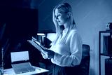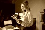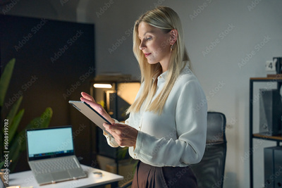 Professional Woman Using Tablet In Modern Office Setting, Showcasing Technology Usage In Workplace Environment, Stylish Modern Interior, Digital Task Management.