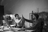 Two Professionals Celebrating Success In A Modern Office By Sharing A High Five, Conveys Teamwork, Cooperation, And Motivation