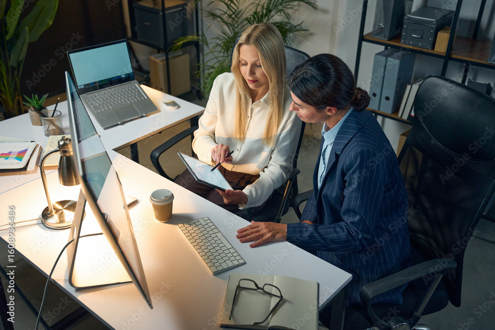 Two Businesswomen Collaborating Over Laptop In Modern Office, Focused On Discussion, Concept Of Professional Teamwork And Strategy, Office Environment With Computers, Coffee, And Documents