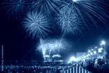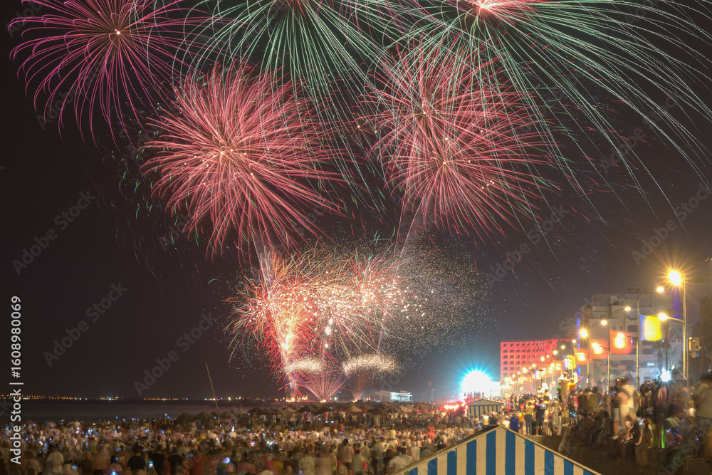 Fireworks over the beach during Aouessou Carnival in Sousse, Tunisia