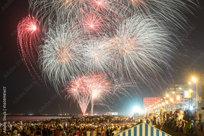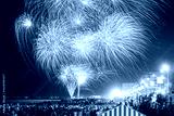Fireworks over the beach during Aouessou Carnival in Sousse, Tunisia