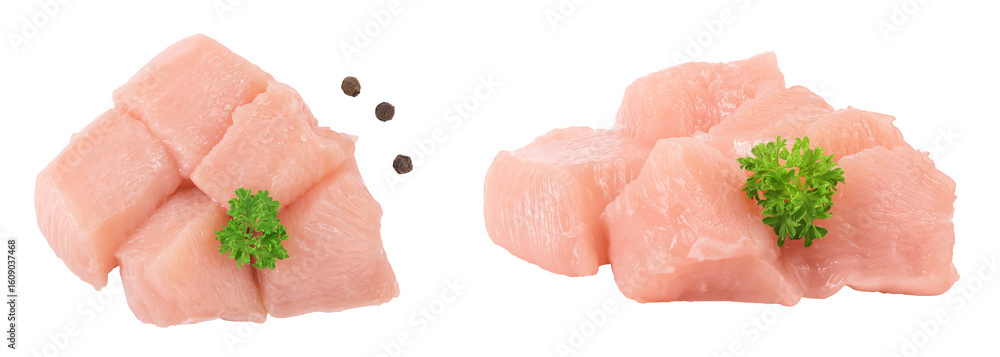 Raw diced chicken fillet isolated on white background. Top view. Flat lay
