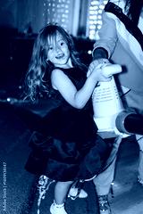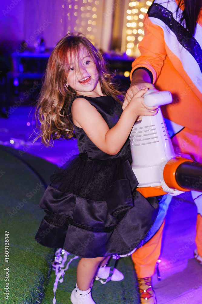 Little beautiful girl in black dress with blower at disco with confetti stripes.