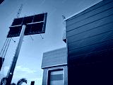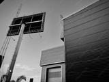 A black and white picture of a high rise bill board in an urban environment