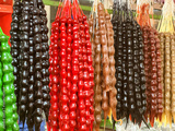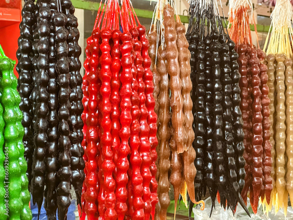 A colorful and appetizing display of traditional Georgian churchkhela sweets hanging in a market. The candle-shaped candies, made from nuts and thickened grape juice, are shown in various colors
