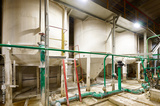 Machinery operates in a modern industrial facility during the day, showcasing equipment and storage tanks for processing materials