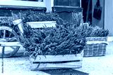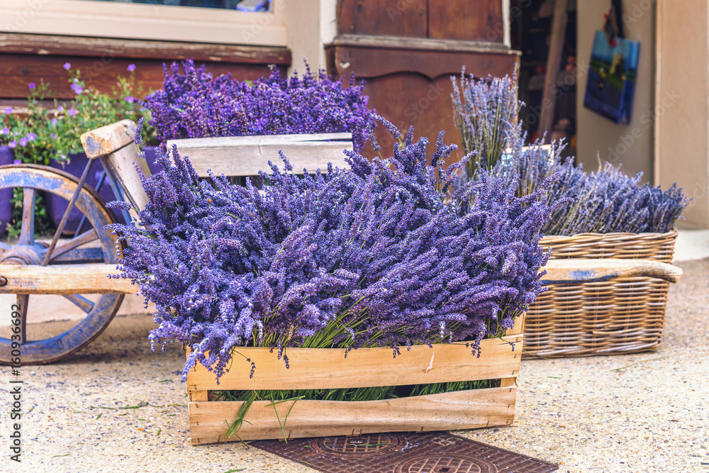 Lavender for sale close-up.Assembled lavender on sale in wooden boxes and a basket.A lot of lavender on sale. Lavender flowers.