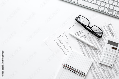 Business report preparing with calculator and glasses on white office background top view mock up