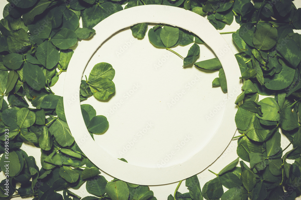 Creative layout made of clover green leaves. Flat lay. Nature background