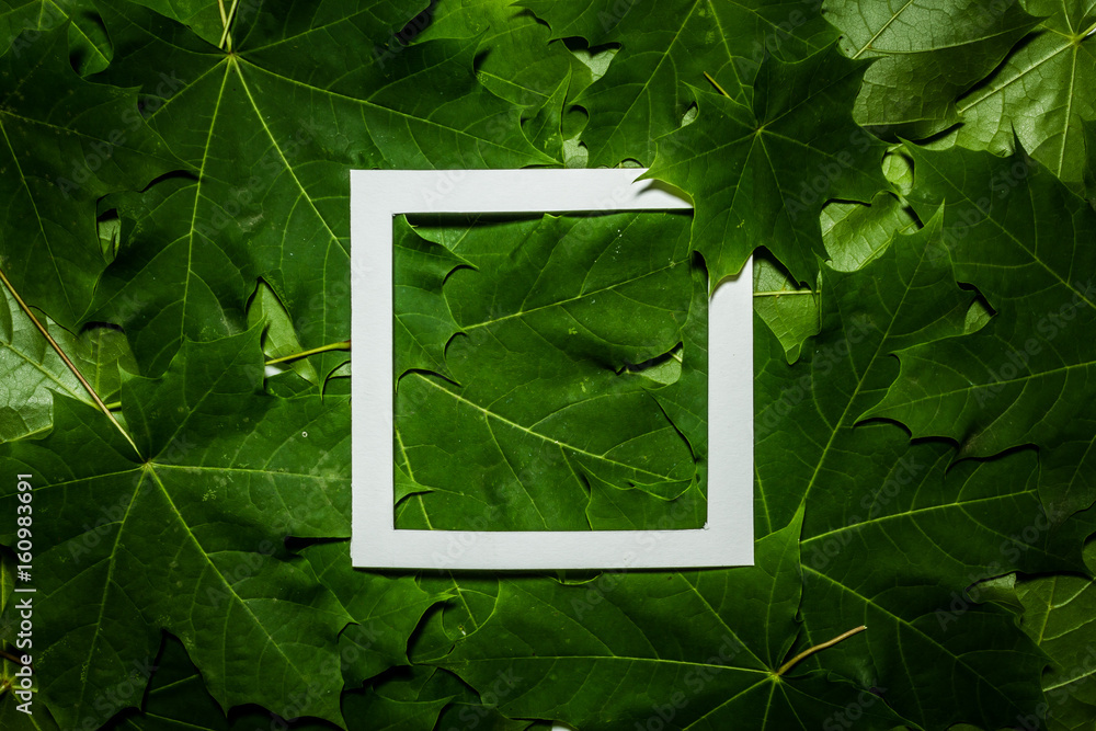 Creative layout made of maple tree green leaves. Flat lay. Nature background