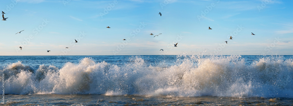 Flock of seagulls flying over the foamy sea waves, blue sky background