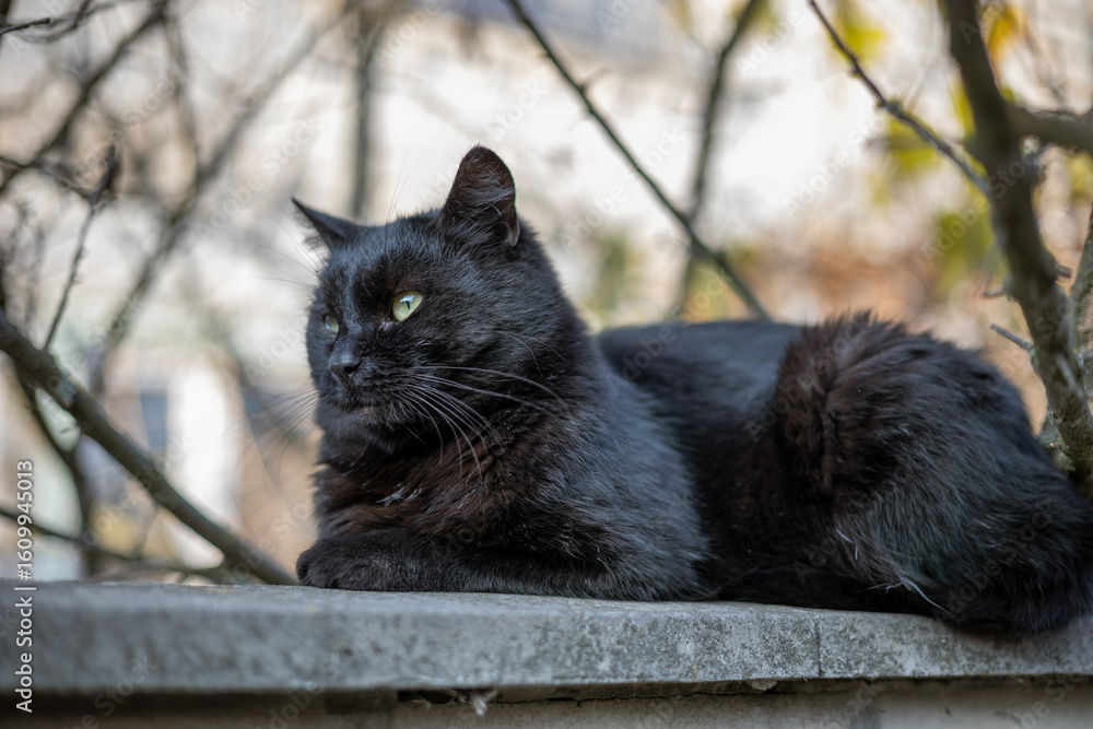 A black cat with green eyes and a white chest patch lies on a concrete wall, with bare tree branches and a blurred background.