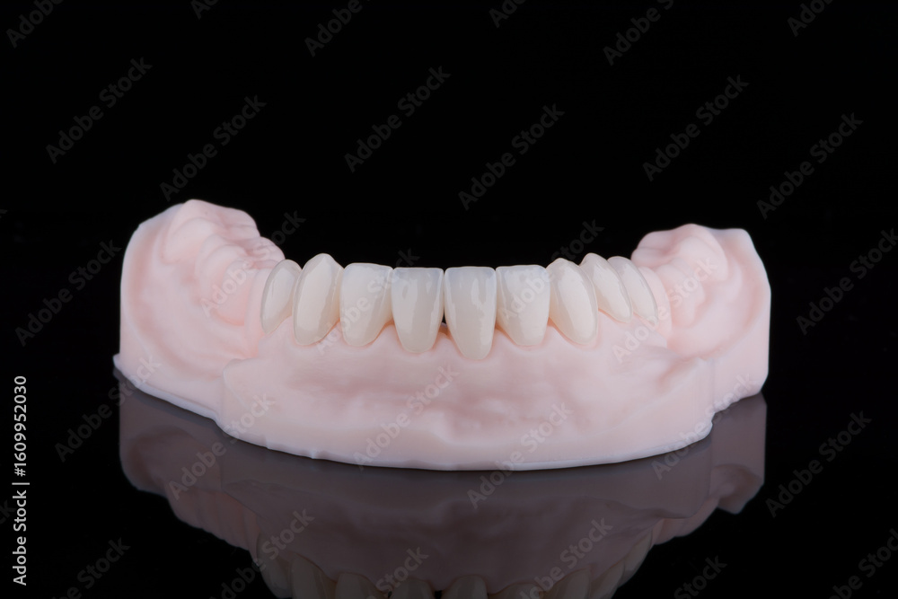 Quality dental zirconium crowns of lower jaw stylized as young bright teeth on 3D printed model.