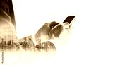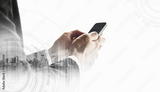 Businessman using smartphone with city, on white background business communication technology