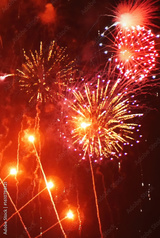 Vertical Horizon Red Firework celebrate anniversary night time celebrate national holiday. Happy new year 2025 4th of july holiday festival. Vertical Red firework Countdown to new year 2025