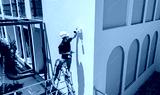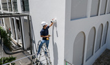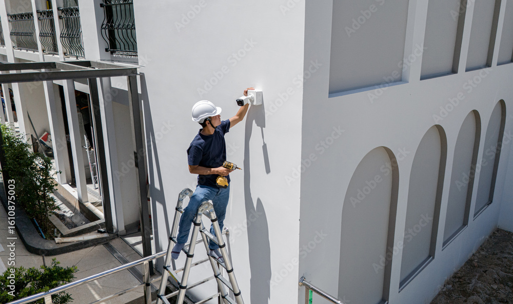 A technician installs a CCTV camera on the facade of a residential building