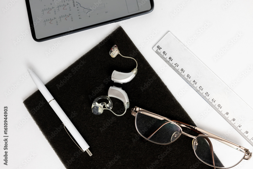 Close-up of behind-the-ear hearing aid with accessories on textured surface, highlighting modern tech in modern world. Hearing aids