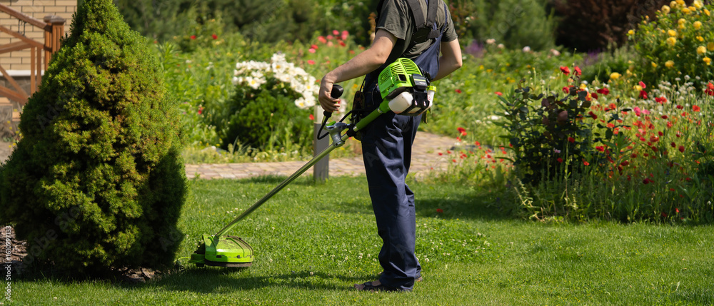 A young white man is mowing a lawn with a lawn mower in his backyard garden