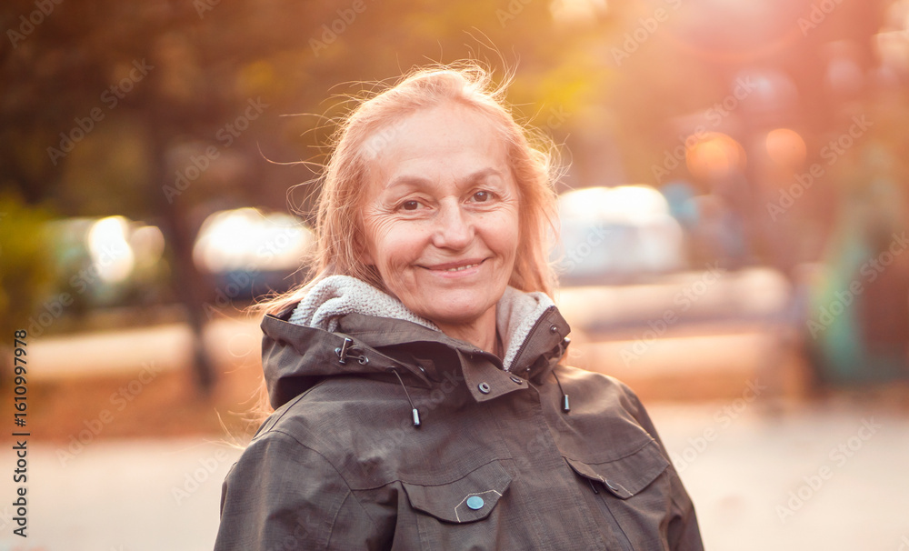 Old cheerful woman with a smiiley face walks in the city in the autumn sunny day.
