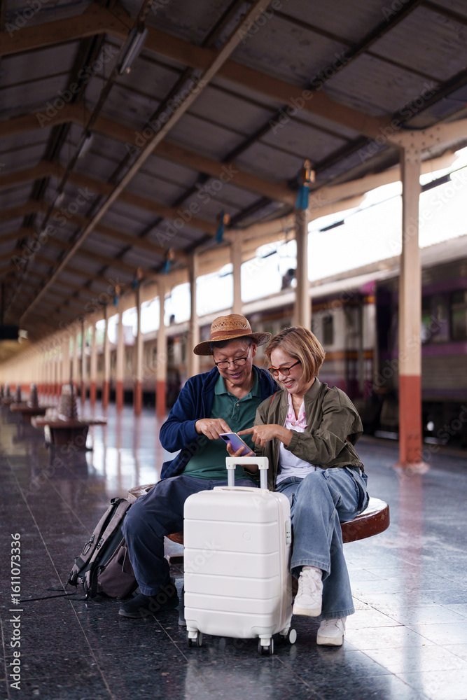 Happy Asian older tourists planning train journey using mobile phone at station leisure travel vacation retirement destination search
