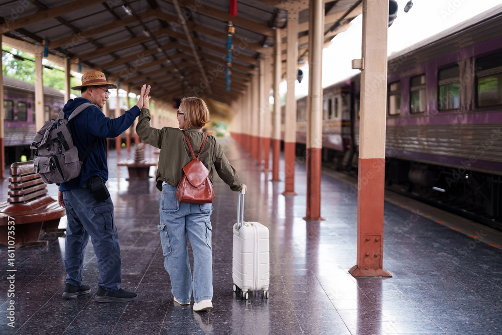 Older Asian couple happy high five train station platform ready vacation retirement journey travel adventure begins