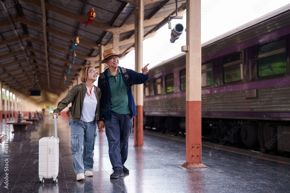 Older Asian couple travels train station platform happy retirement vacation adventure walking pointing together explore journey luggage destination