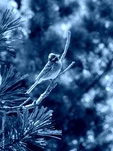 Pine bunting perching on a branch of siberian pine