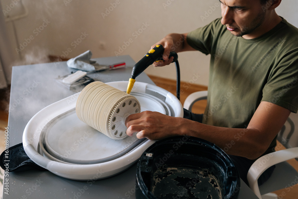 Male cleaning humidifier filter using steam cleaner, removing dust and maintaining indoor air quality with careful, thorough sanitizing technique. Concept of maintenance modern home appliance.